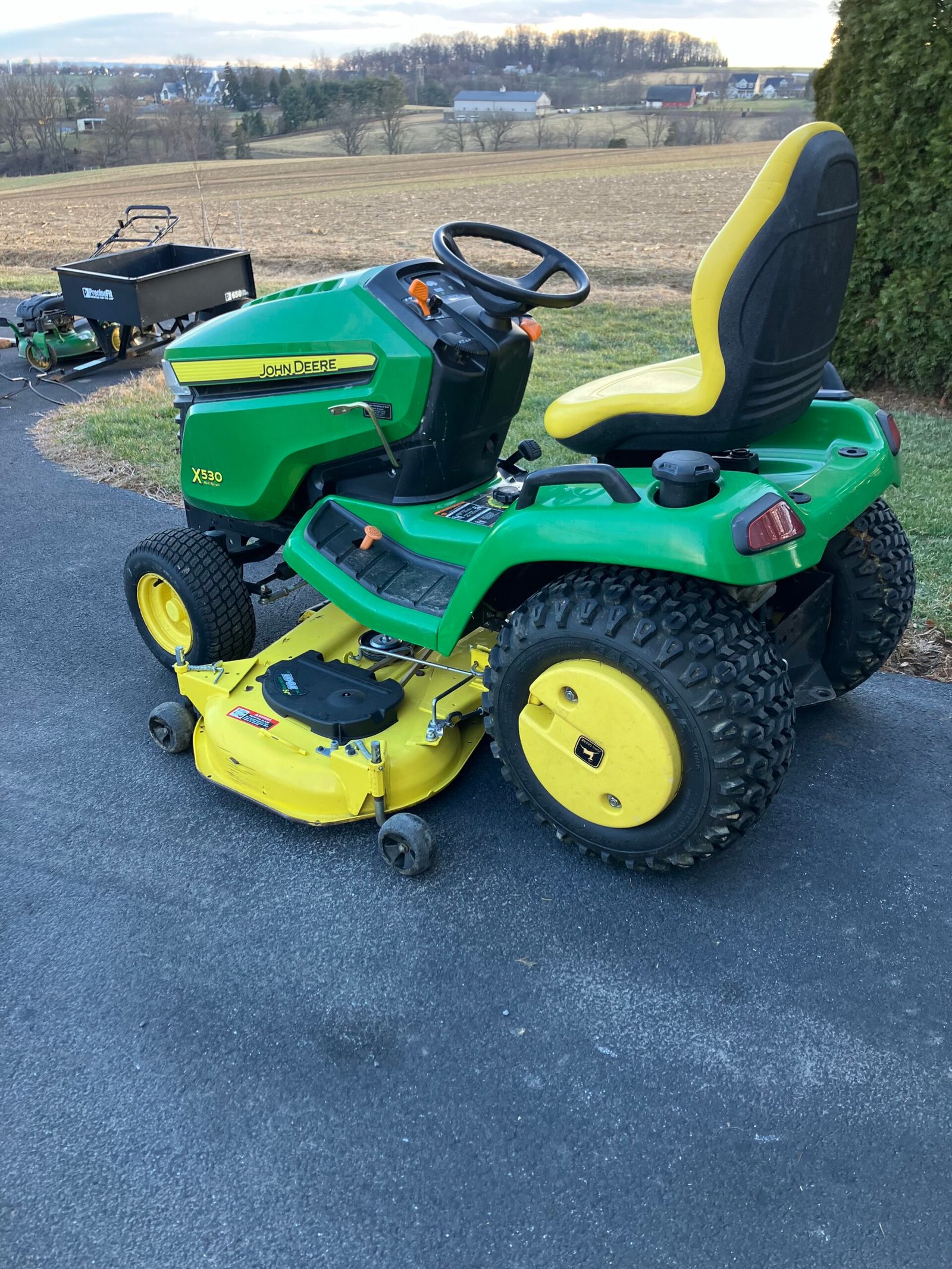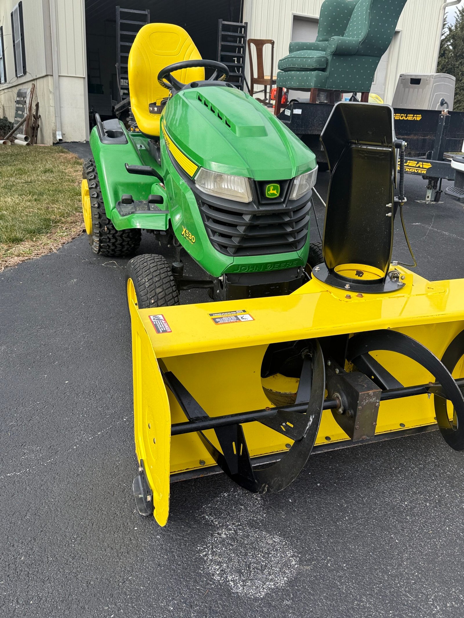 TOOLS & SHOP ITEMS: John Deere X-530 riding mower w/ 54” deck, power lift, grass catcher, power steering, 510 hours; John Deere #47 snowblower attachment for 500 series tractor; Troy-bilt horse size tiller; Honda GVC-170 self-propelled mower; mower ramps; car ramps; 3-ton hydraulic floor jack; 3-ton jack-stands; Snap-On 1/2″ air wrench; pot-belly stove; Brooder stove; coal-oil stove; (2) large ice chests; gun case; misc. hunting clothing; bikes & bike carrier; pickup bed tarp; Cozy-World propane heater; 50-gal. propane tank; North-star 10,000 PP6 generator w/ electric start; Husky 7-hp air compressor w/ 60 gal. vertical tank (11.8CFM @ 40-psi); Echo leaf blower & vacuum; Stihl 011AVT chainsaw; JD 40-v chainsaw; Dewalt electric saw-zaw; barbell set; handheld vacuum; sewing machine cabinet; Milwaukee oscillating multi-tool saw; red metal wagon; misc. wrench & socket sets; misc. tools; garden hose & reel; Coleman propane 2 burner camp stove; plus more.