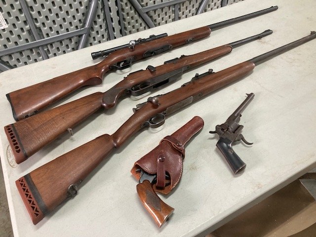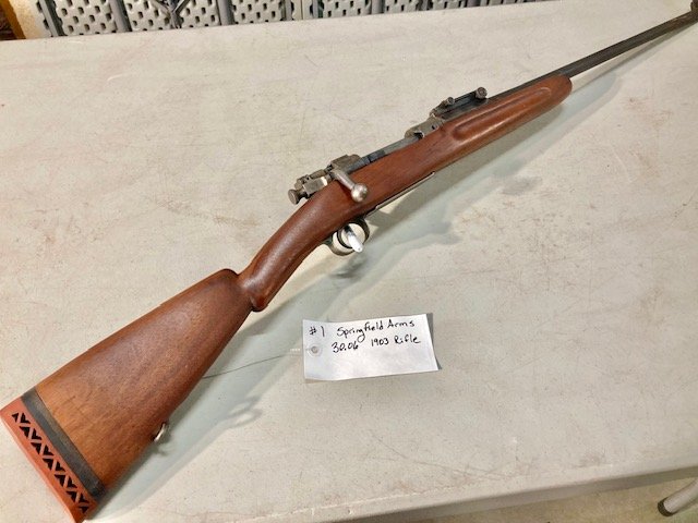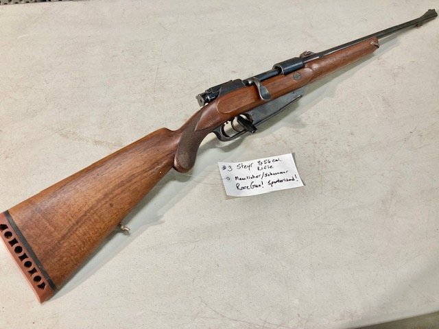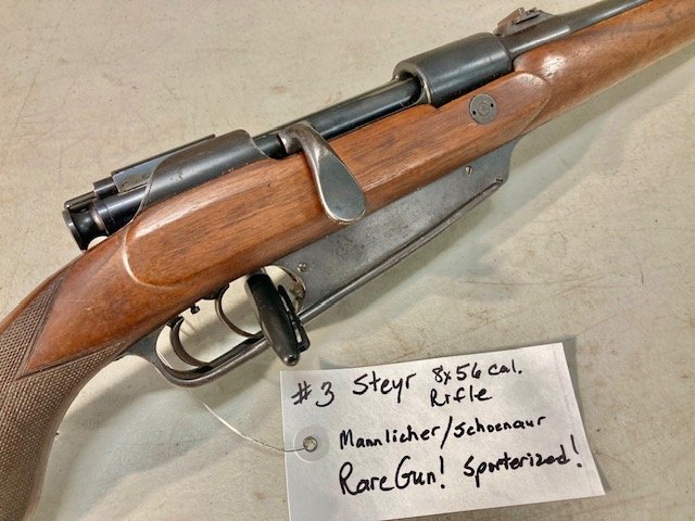 GUNS & FISHING: Springfield 1903 30.06 bolt-action rifle; Savage mod 4-C bolt-action .22-cal rifle w/scope; RARE 1908 Steyr Mannlicher/Schoenaur 8×56 bolt-action rifle; RARE 1850’s Pin-fire revolver; Iver Johnson .45-cal 8-shot revolver (parts); 5-fishing rods; lures & tackle box loaded.