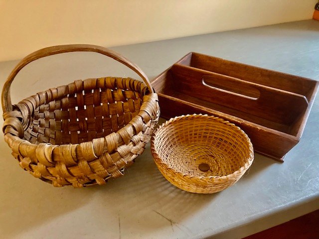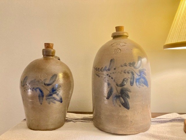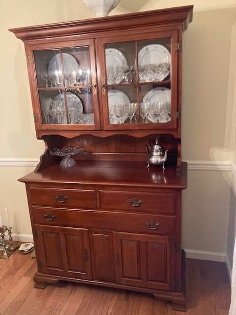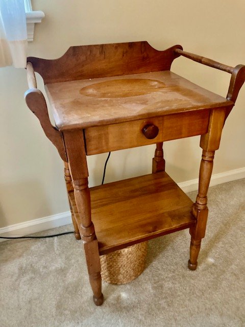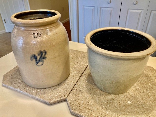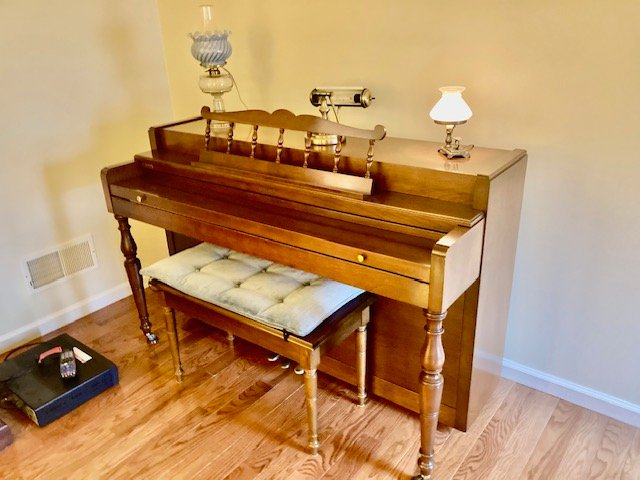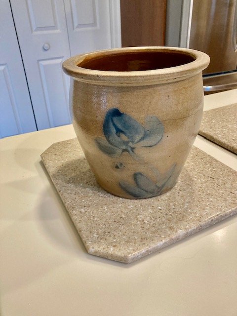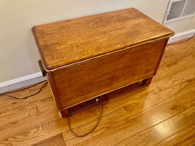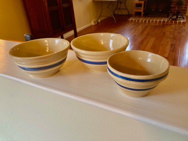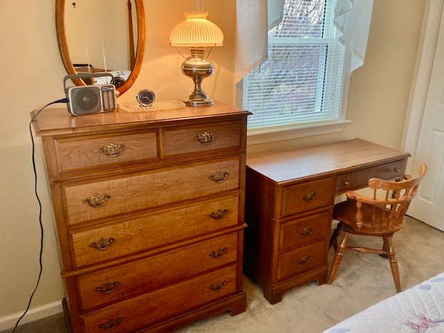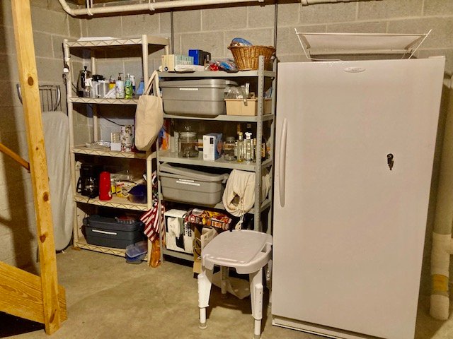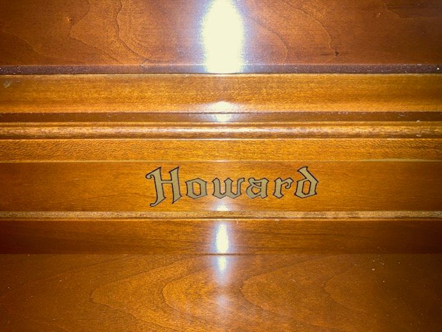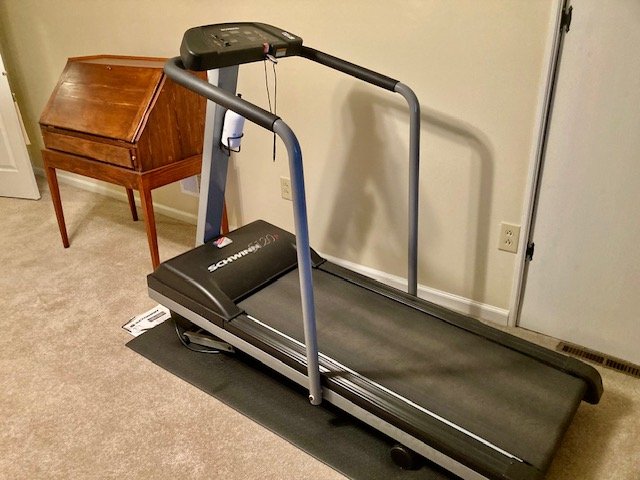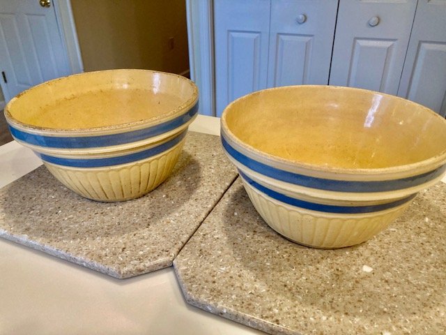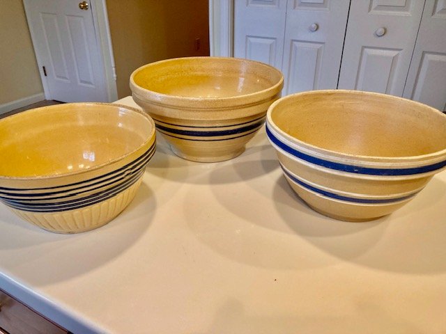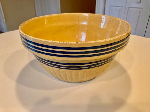 PERSONAL PROPERTY: blue decorated crocks & jugs; blue banded yellow ware bowls (nice); 2-Whirlpool upright freezers; Whirlpool washer & dryer; Howard piano (nice); Cherry hutch & drop-leaf table w/4-chairs; dinette set; sofa & chair; 2-doble beds; 2-maple high chests; antique slant front desk; bookcase; Schwinn treadmill (good); pine wash stand; 2-wooden rockers; tin punched pie safe; mini blanket chest; ginger bread mantle clock; repro radio; quilts & blankets; antique silver caddy; splint baskets; kitchen & baking items; 2-dinnerware sets; etc.