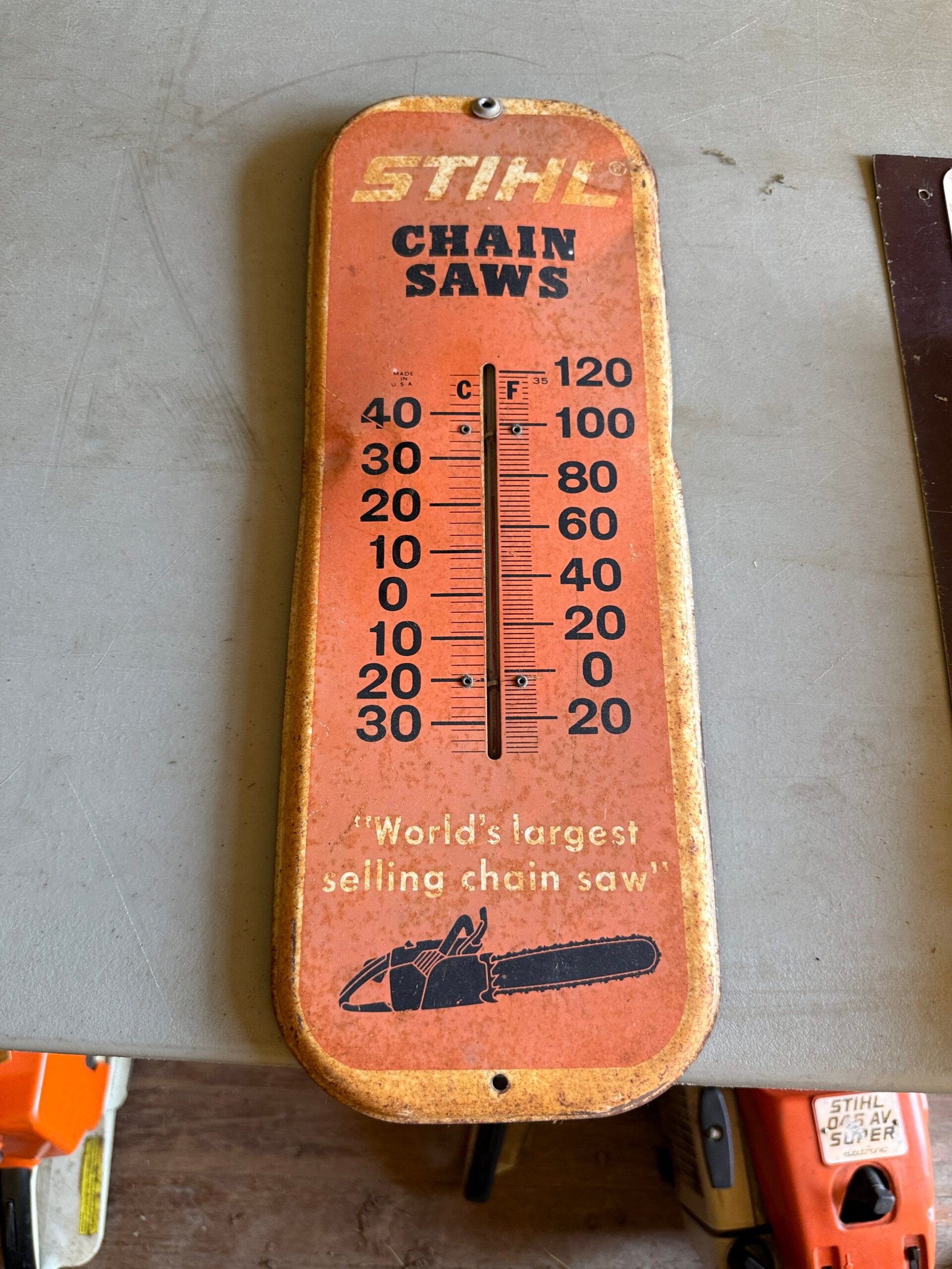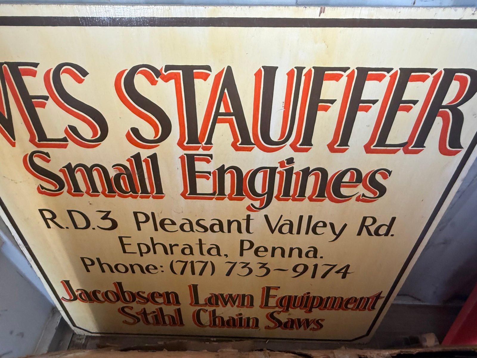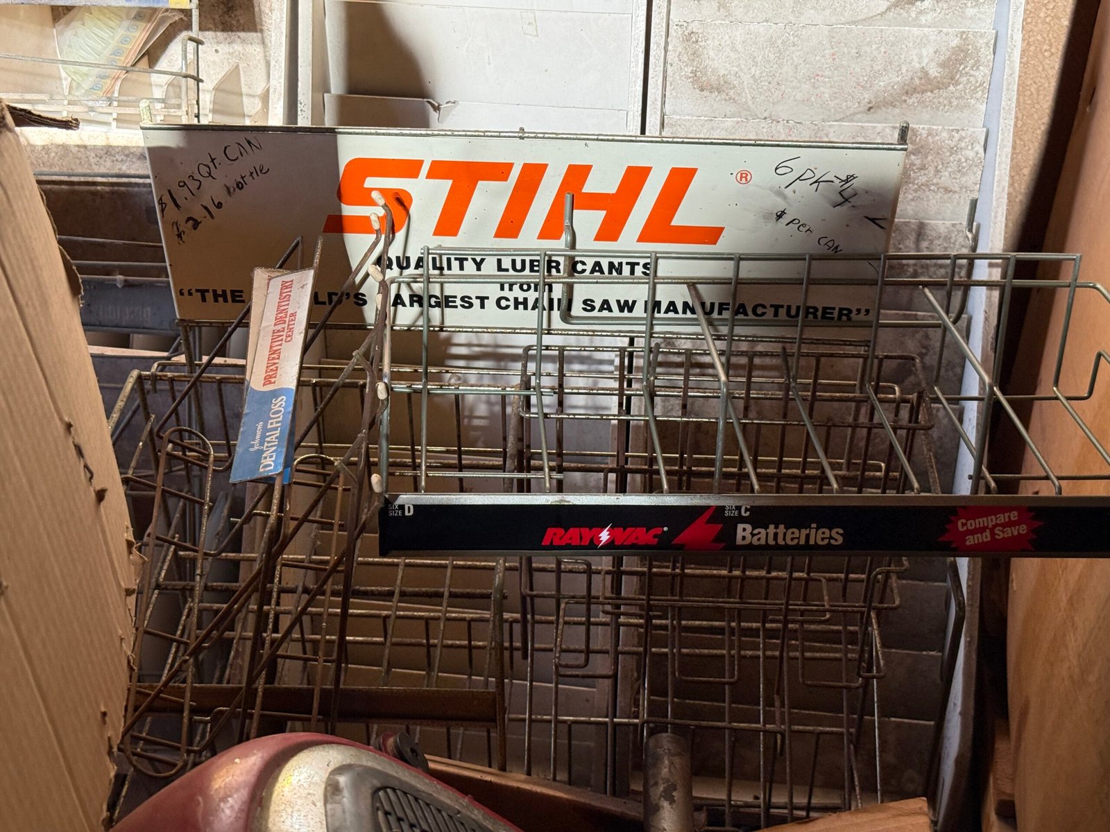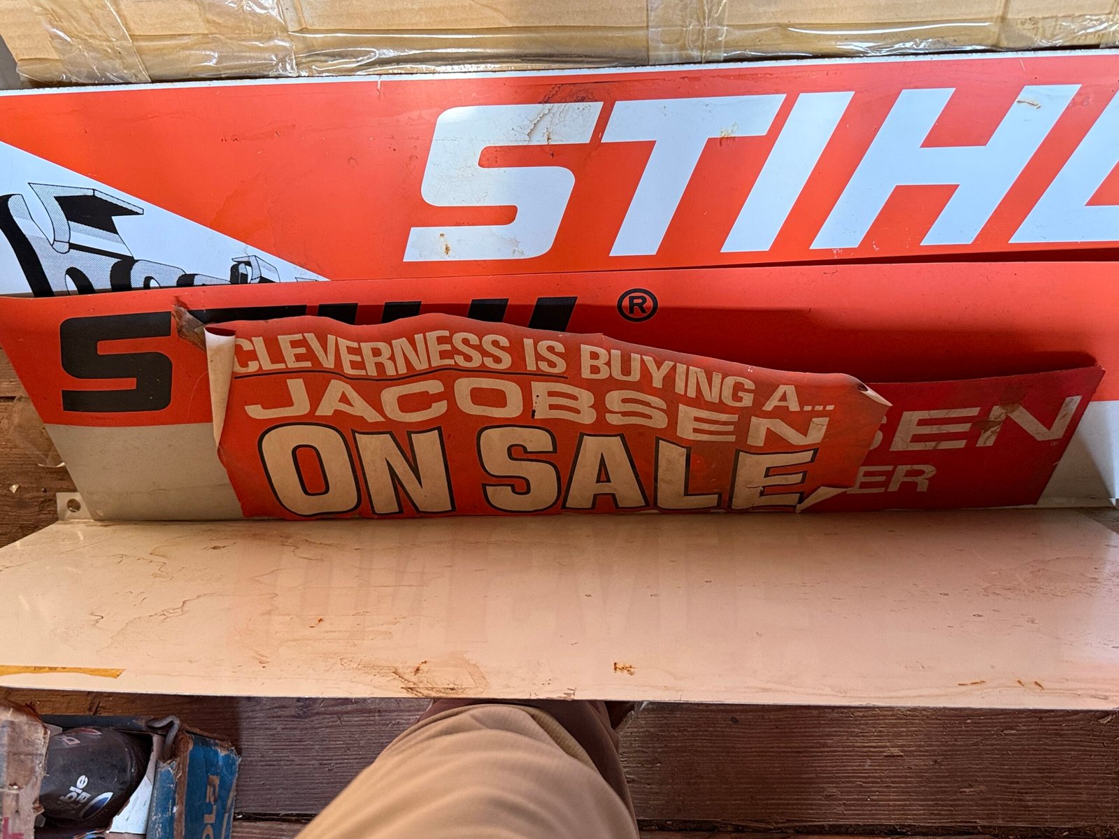 Stauffer wooden signs; Roper, Yard Pro, Wisconsin plastic signs; more adv. signs; Antique Stihl Chainsaw
