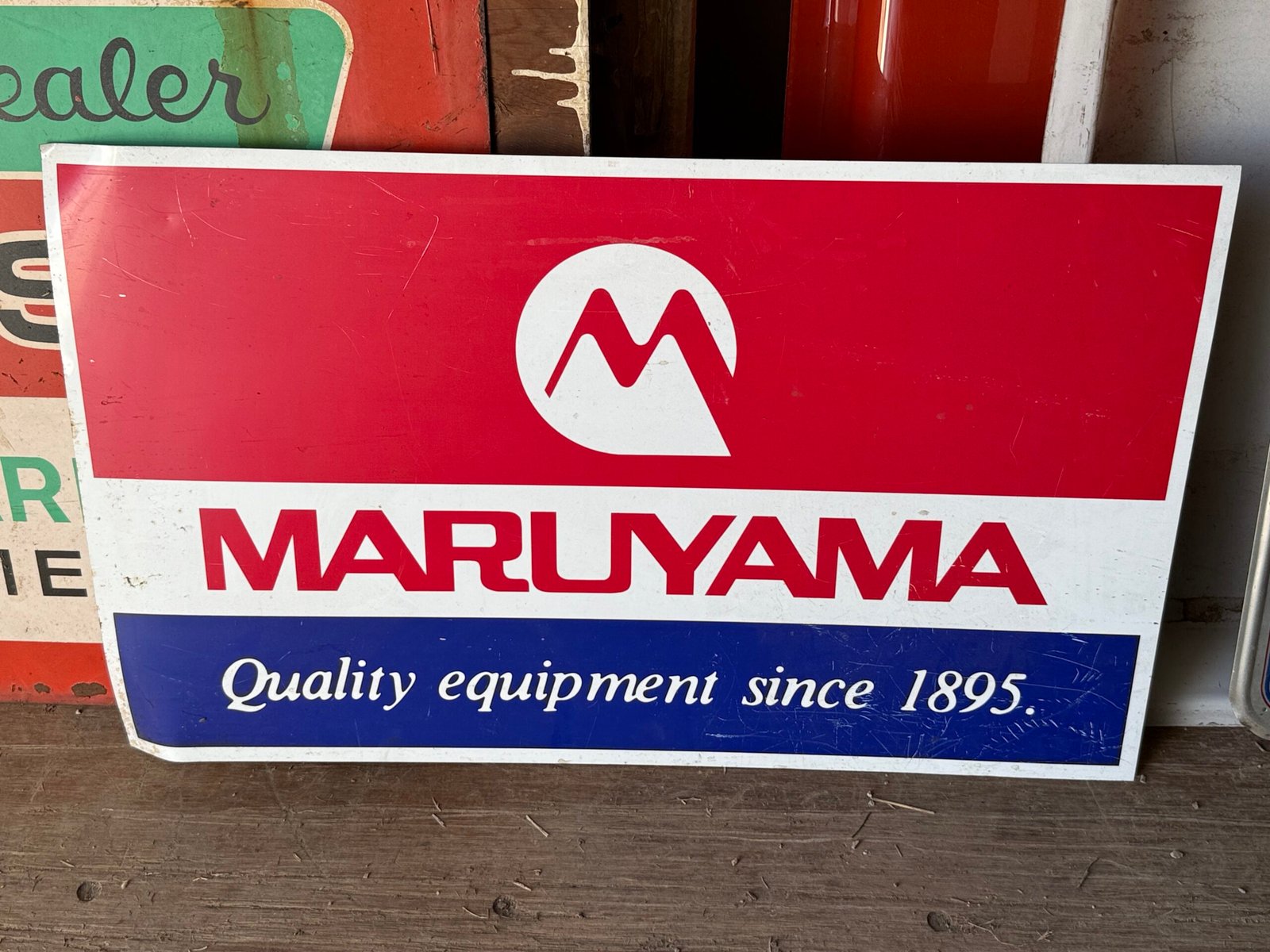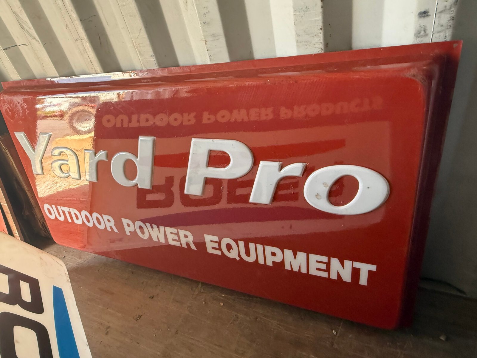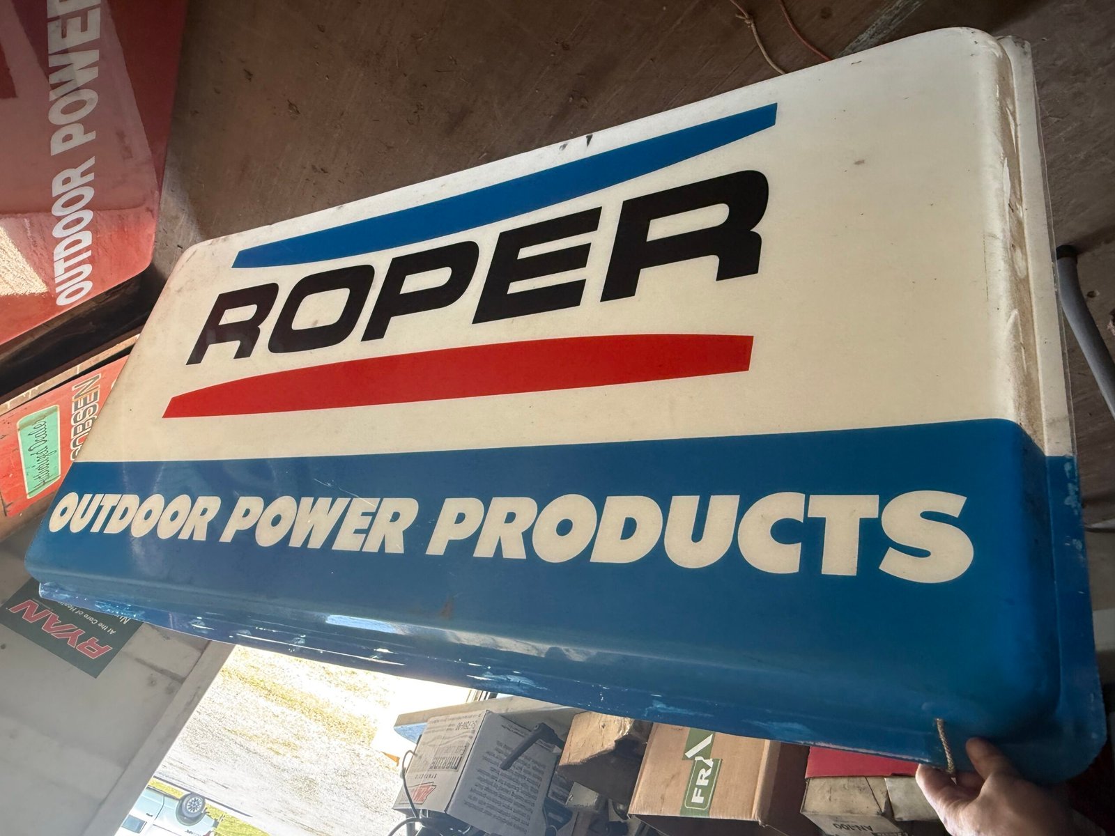 Stauffer wooden signs; Roper, Yard Pro, Wisconsin plastic signs; more adv. signs; Antique Stihl Chainsaw