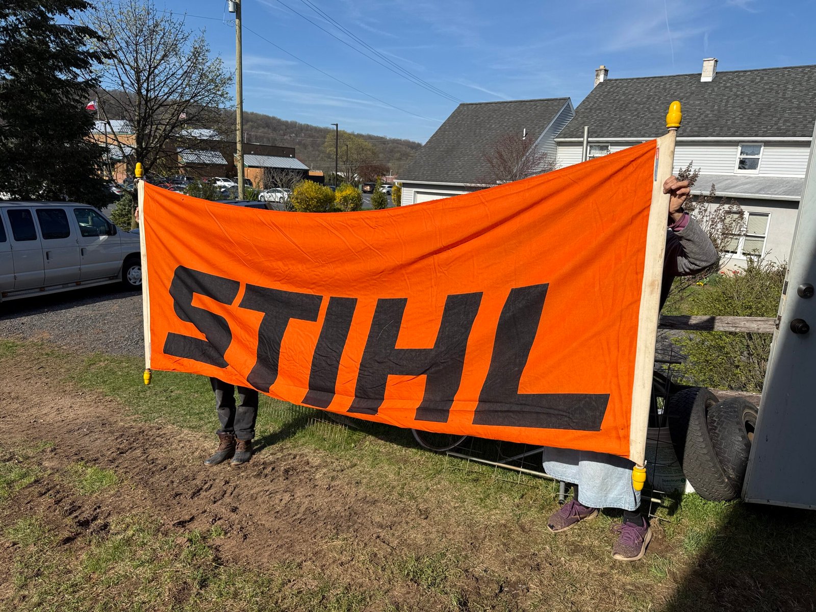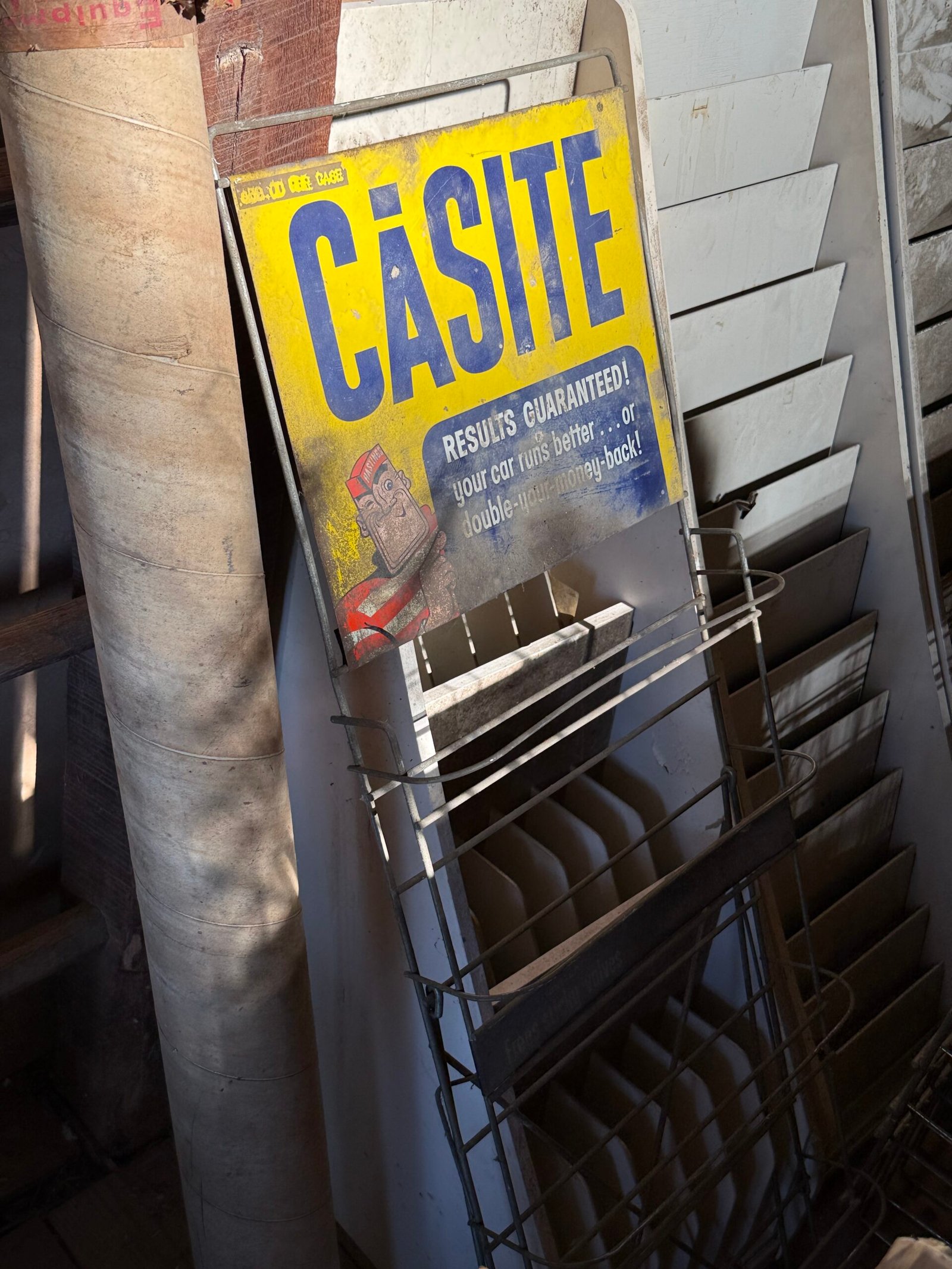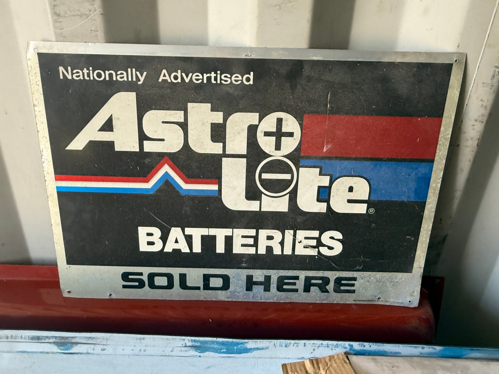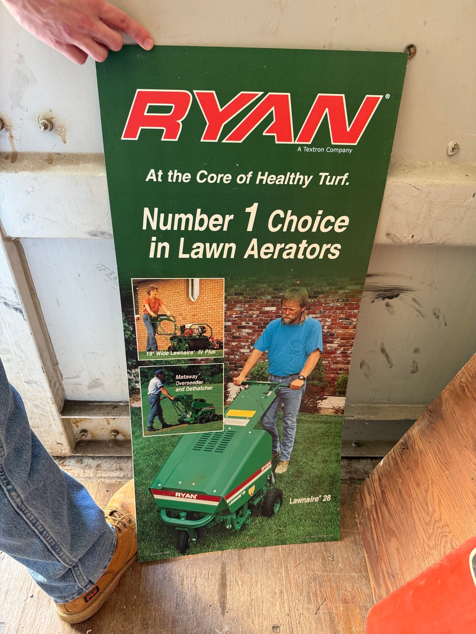 Stauffer wooden signs; Roper, Yard Pro, Wisconsin plastic signs; more adv. signs; Antique Stihl Chainsaw