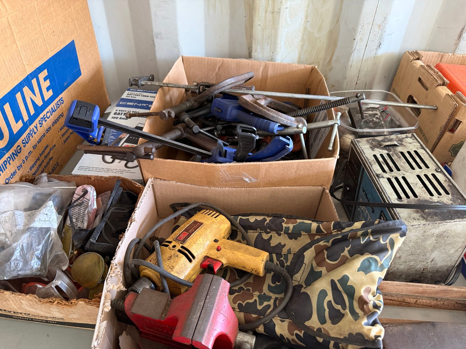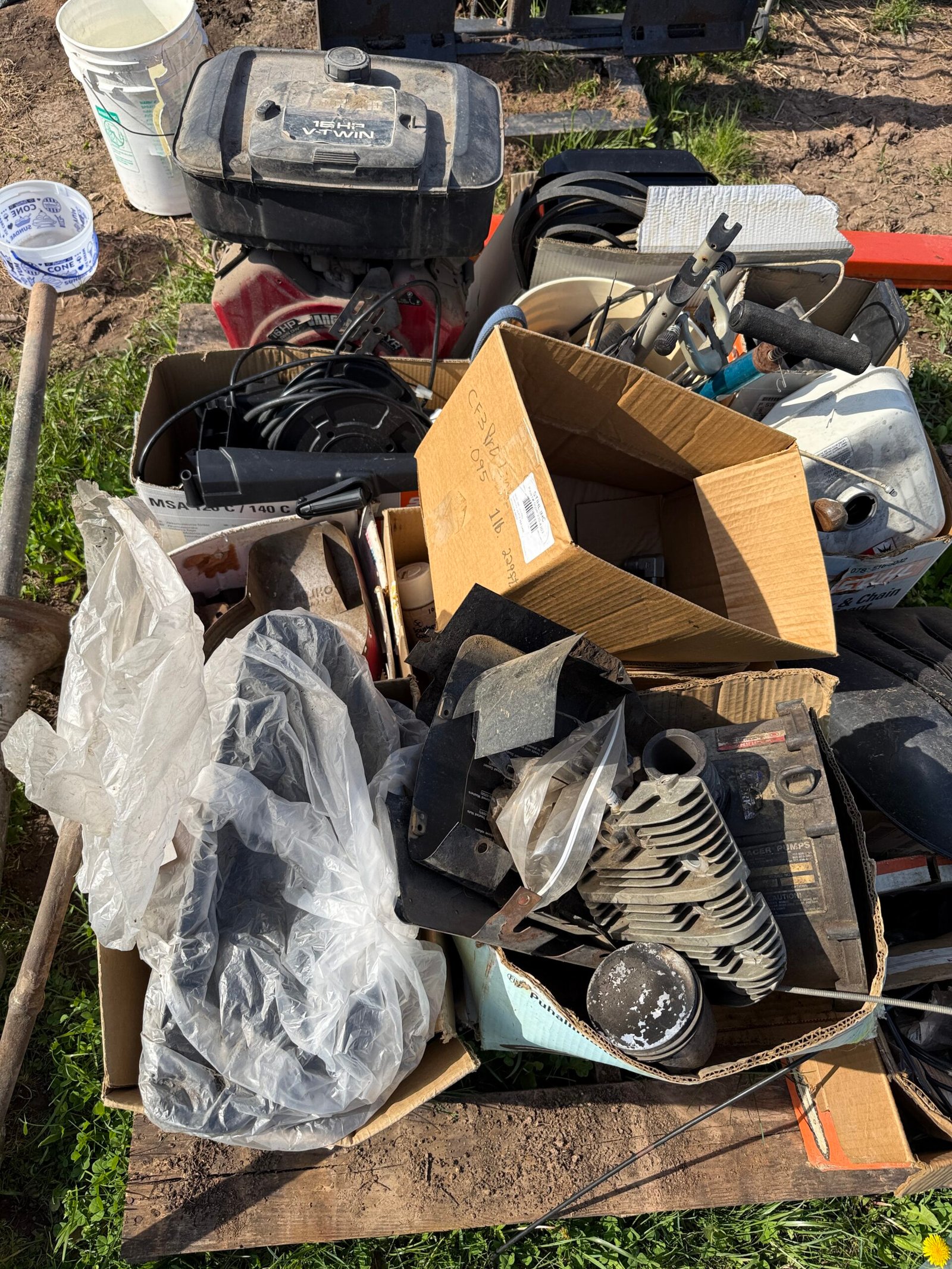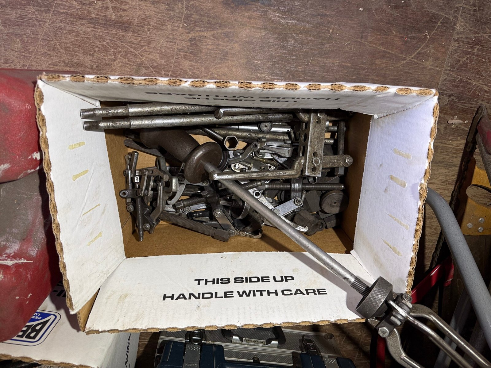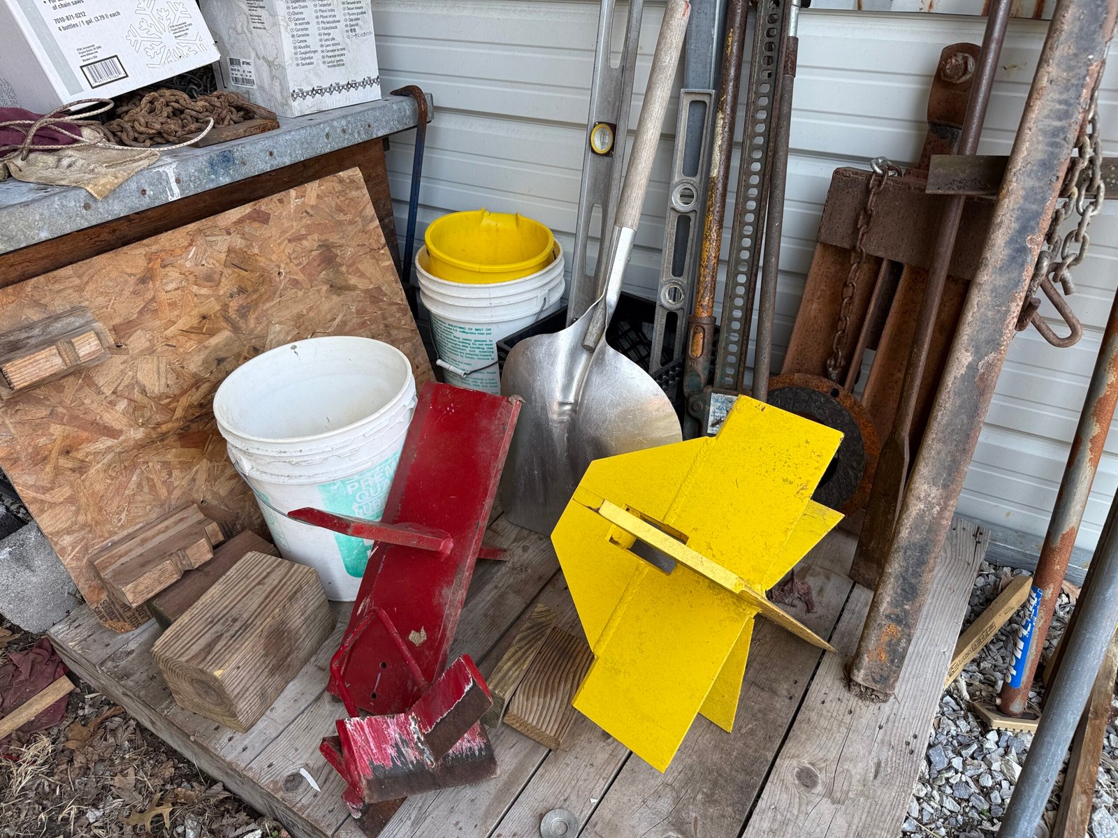 jack; car jacks; 5’ front loader bucket; belt drive buck saw; power tools; Sun Service alternator tester;