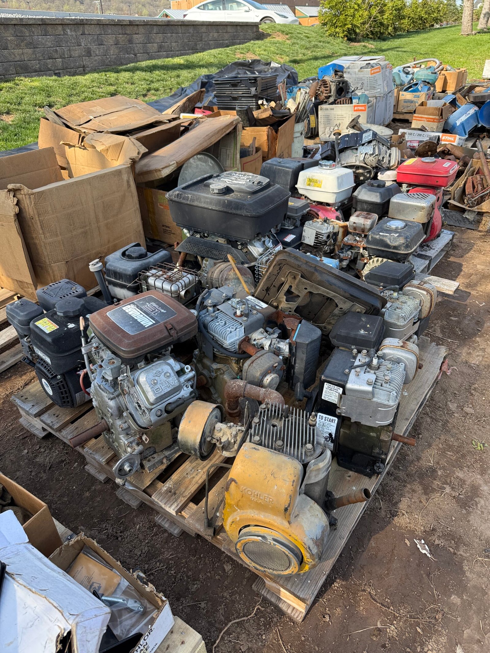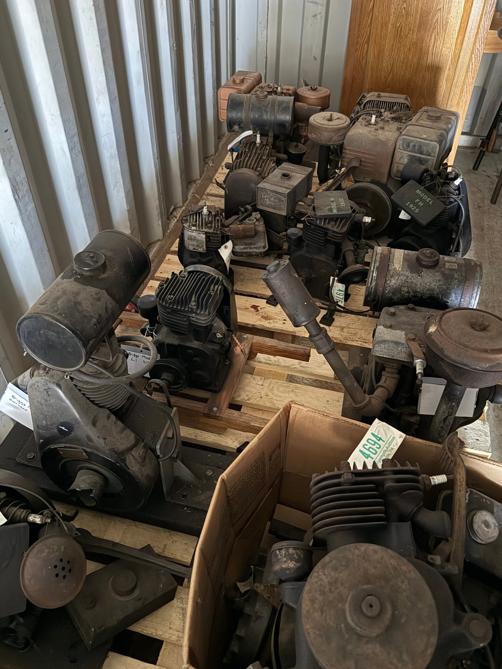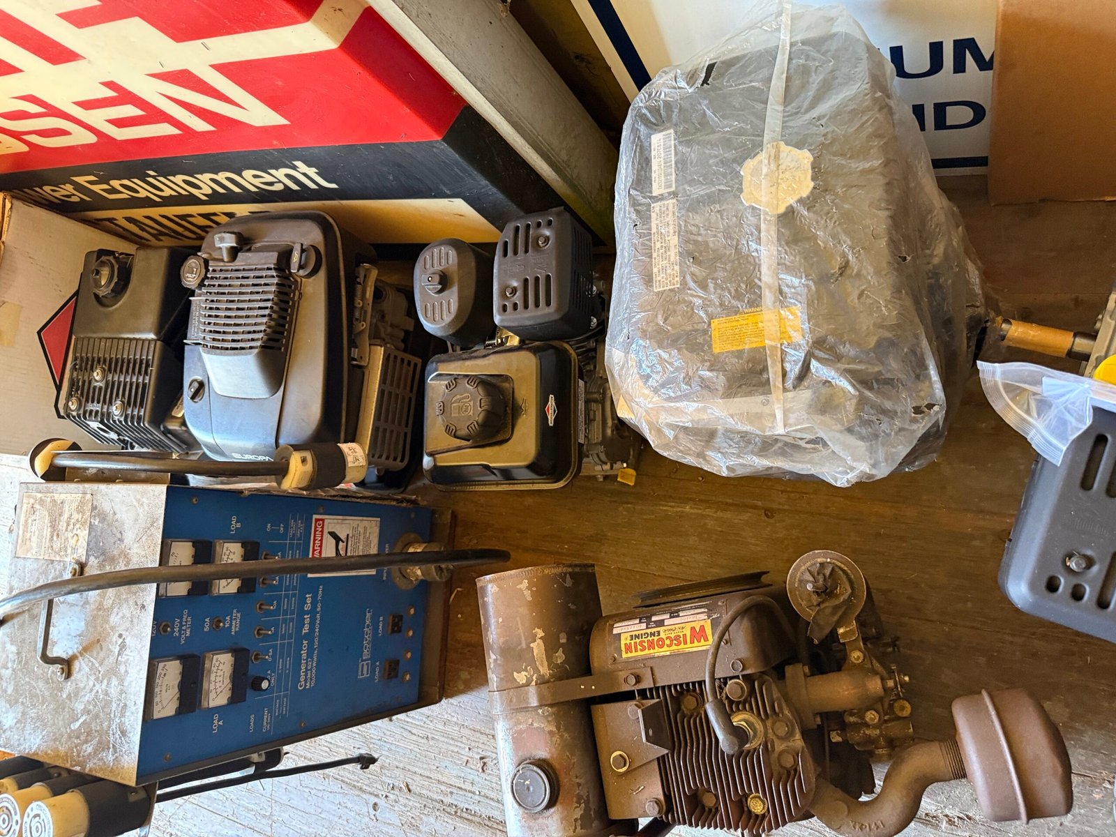 INVENTORY: NOS: New pressure washers; Em-glo air comp.; (10+) 5-15HP engines; Stover engine Parts: Onan,