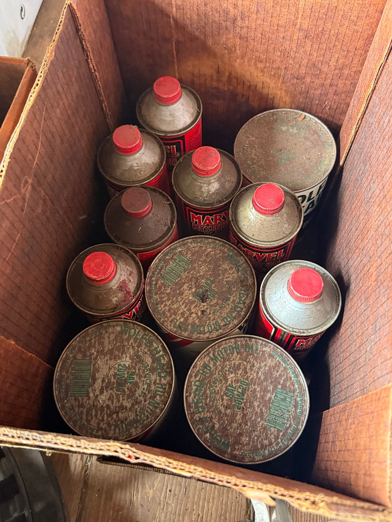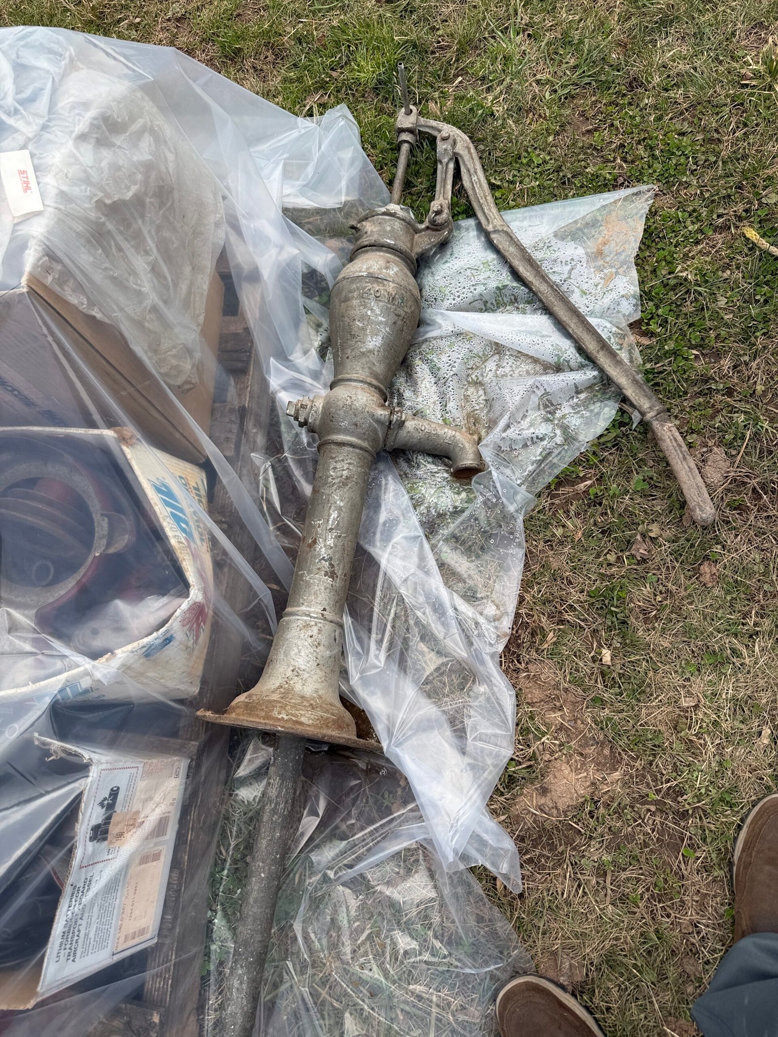 engine; Hand water pump & trough; trolley hay hook; full metal oil cans; David Bradley tractors & engine;