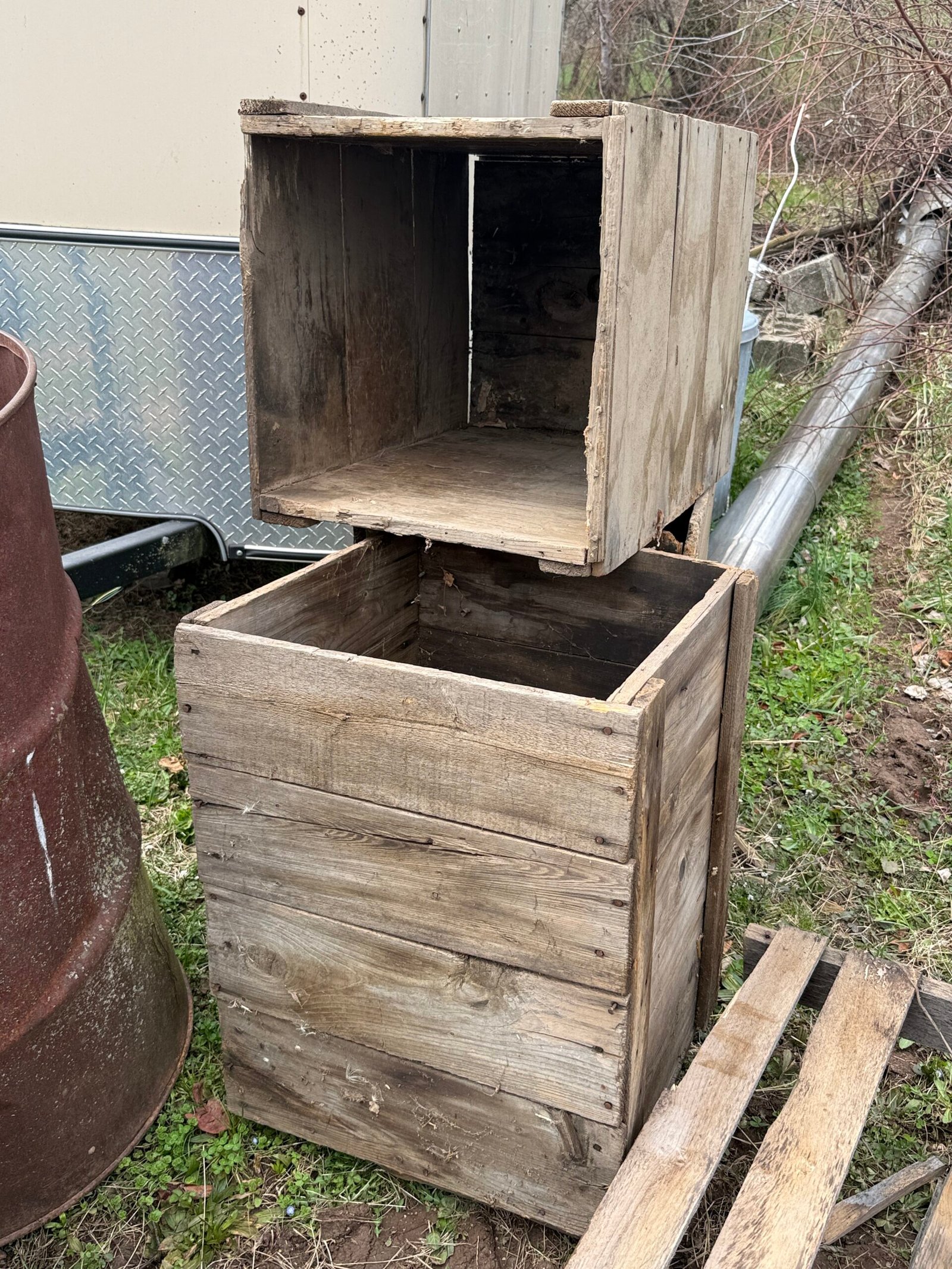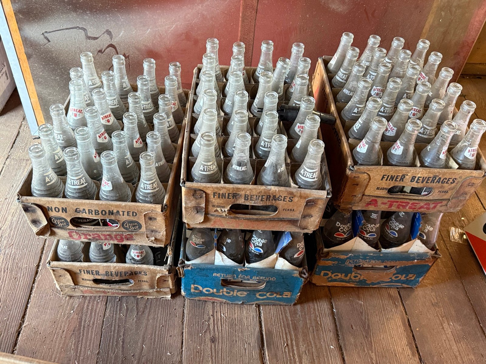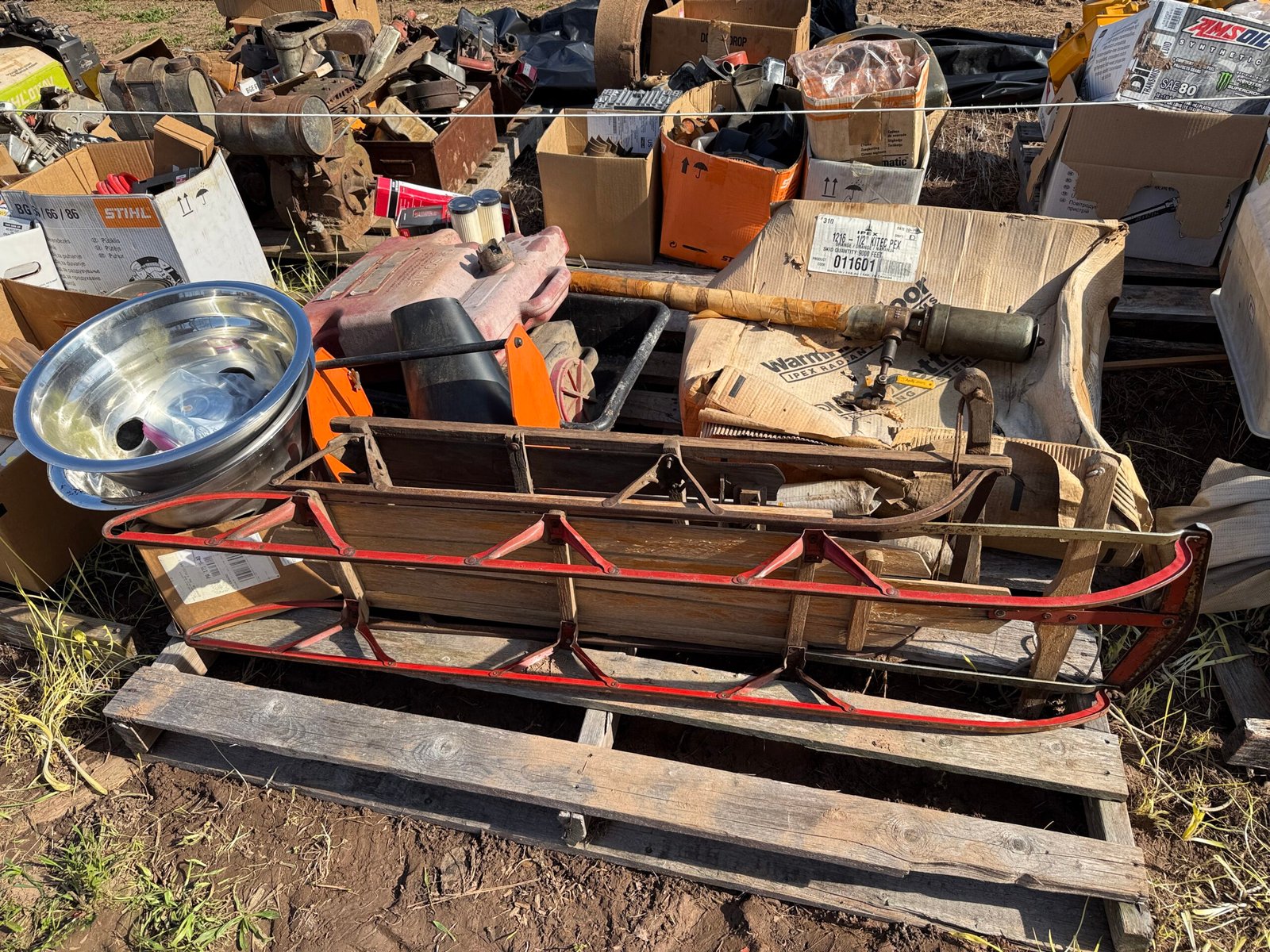 clocks; cart for cylinders; hog troughs; mannequin; church bench “Stauffer’s Mennonite Church”; Vintage