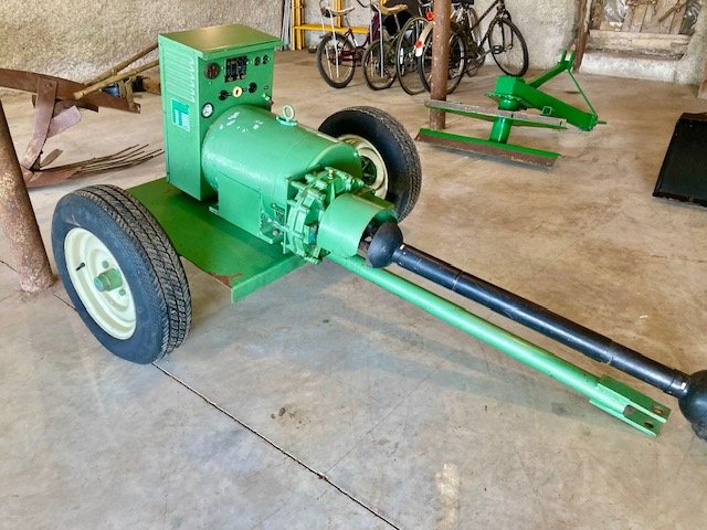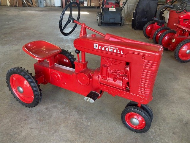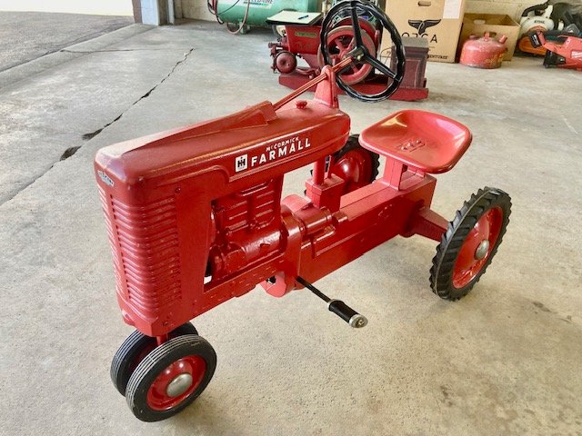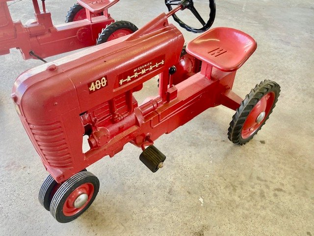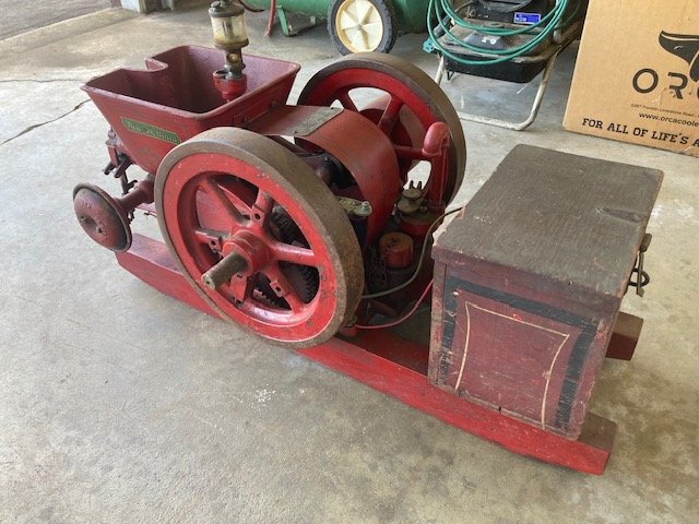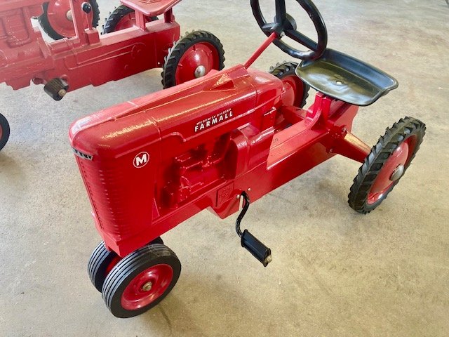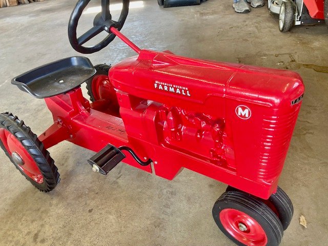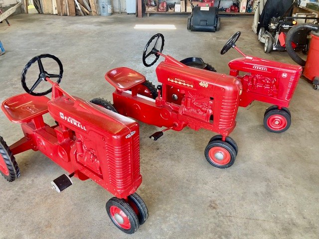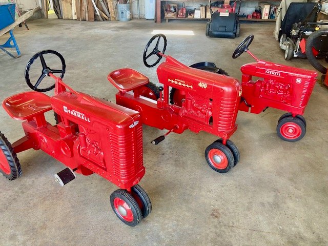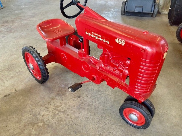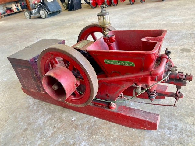 TRACTOR, FARM EQUIPMENT & ANTIQUES: New Holland ½ hp hit-miss engine #5927 (nice!); (2) Kurtz Foundry binder tongue wheels; early New Holland grinder/mixer w/original paint & stencil; detailed small replica sleigh, maroon w/gold trim; JD 955 4×4 DSL tractor 925 hrs. w/cab & 70A loader; 3-pt scraper; pallet forks; snow blade; Woods SB60 PTO snow blower; JD 7’ 3-pt. sickle-bar mower; MX54 Woods F23 zero-turn mower w/power blower & catcher, 717hrs, (new engine); Maxi-Power 25kw PTO generator; walk-behind potato plow; mobile scaffolding set; 16’ 7000GVW IH dual axle trailer; 1976 3000GVW EZ 6’x8’ mulch trailer; STOELTING soft ice cream machine on SS cart (NICE!); 3-FARMALL pedal tractors!