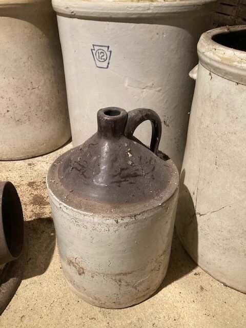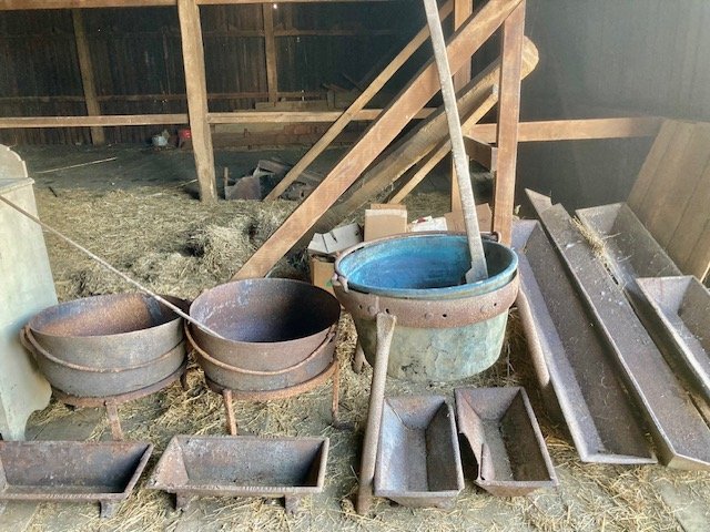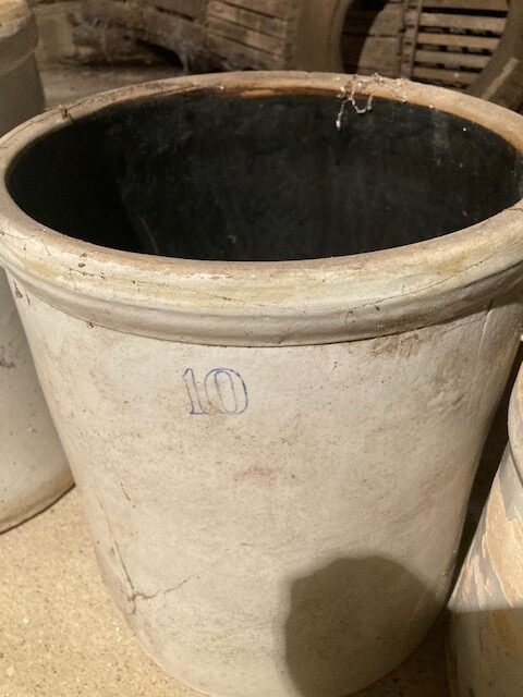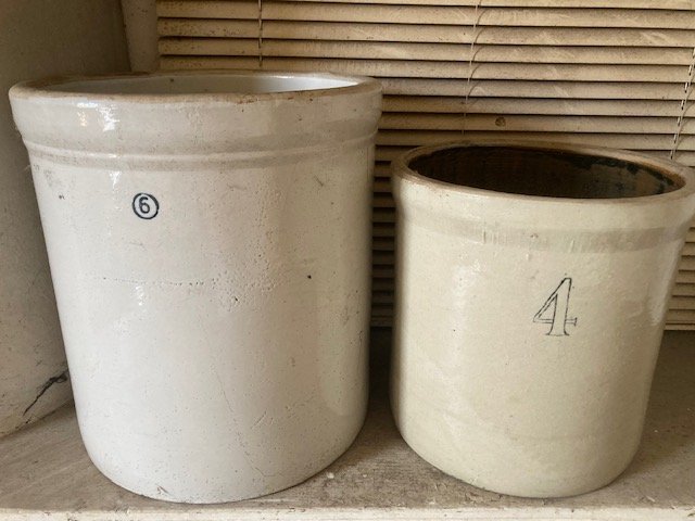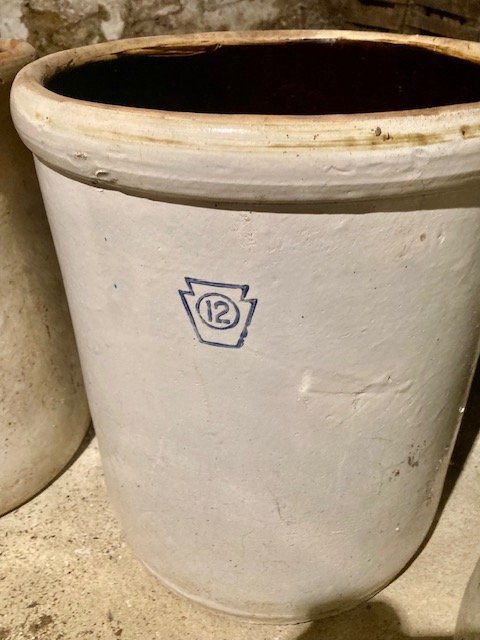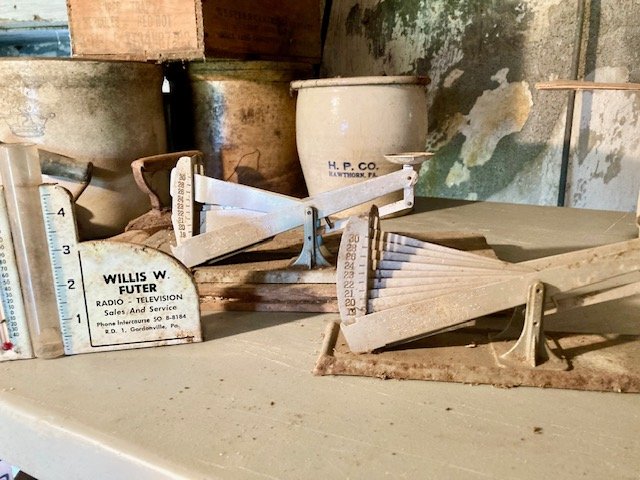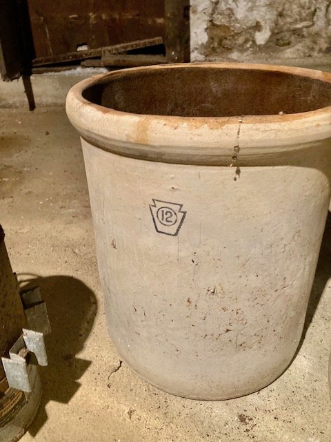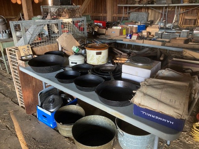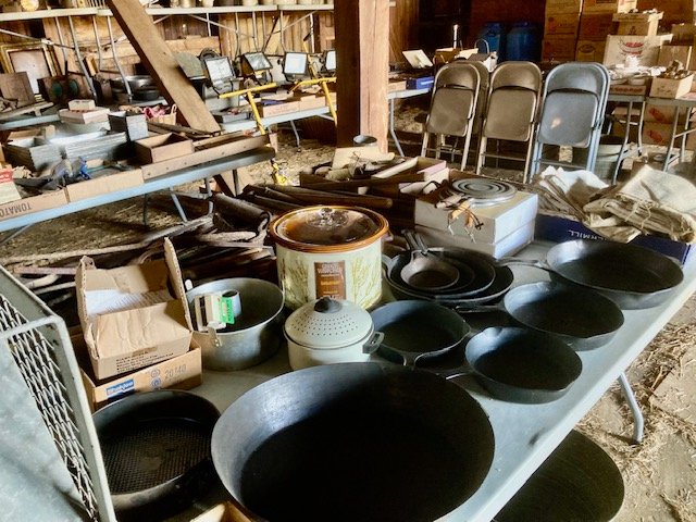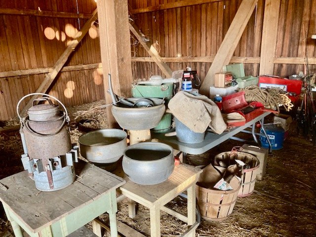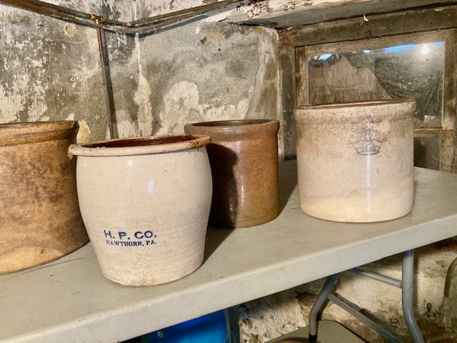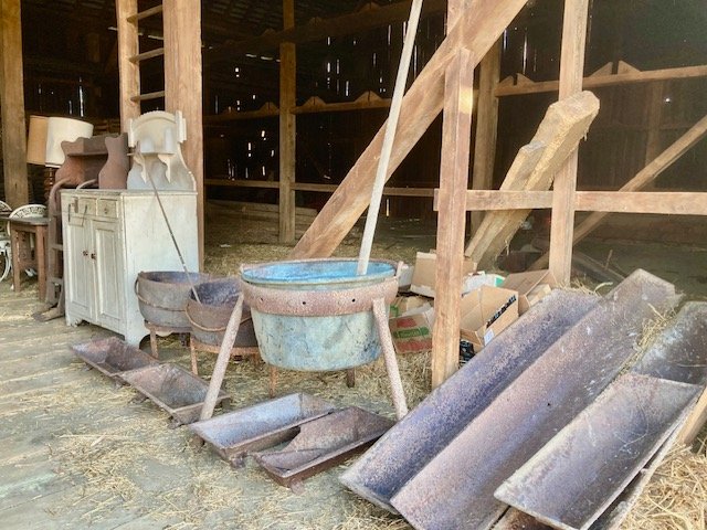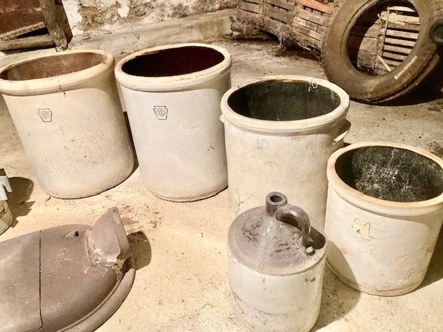 9-AM: Antiques & Personal Items: 2-#12 crocks; #10 crock; 25-old crocks & jugs; H P Hawthorn, PA crock; old silver mesh purse (nice); Moseman PB tin; 12-wire egg baskets; 2-Acme egg scales; beetle boot jack; (3) 10-hole chicken nest boxes; wooden chicken crates; chicken feeders; Brunnerville cast iron hog troughs; cast iron cherry stoner; early farm tools; 25-apple crates; 100’s of canning jars, old green jars; old books; early lithographs; antique wooden furniture; sad irons & trivets; cast iron pans; redware pie plates; kitchen primitives; 3-apple butter kettles; many more rare finds in this 200-year old house!